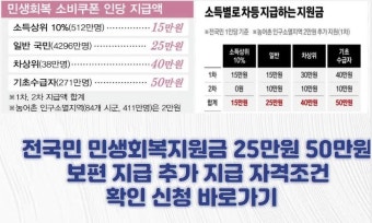| 주요 기준 | 소득 수준에 따른 차등 (기초생활수급자, 차상위, 일반 국민), 비수도권/농어촌 추가 지급 | 잠정 '기준 중위소득 210%', 고액 자산가(주택/금융소득) 추가 배제 검토 | 사각지대 보완 및 형평성 강화 목적. 과거 재난지원금 사례 참고. |