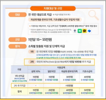 | 1인당 지급액 (일반 국민 기준) | 15만 원 | 10만 원 | 지급 대상이 줄어든 만큼 1인당 지급액도 조정됨. |