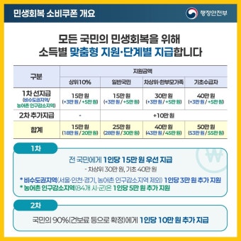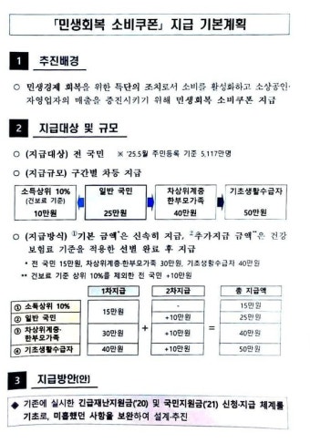| 2025년 7월 21일 ~ 9월 12일 | 1차 민생회복 소비쿠폰 지급 (전 국민 보편적 차등 지급 시작) | 기초생활수급자 40만원, 일반 국민 15만원 등 |